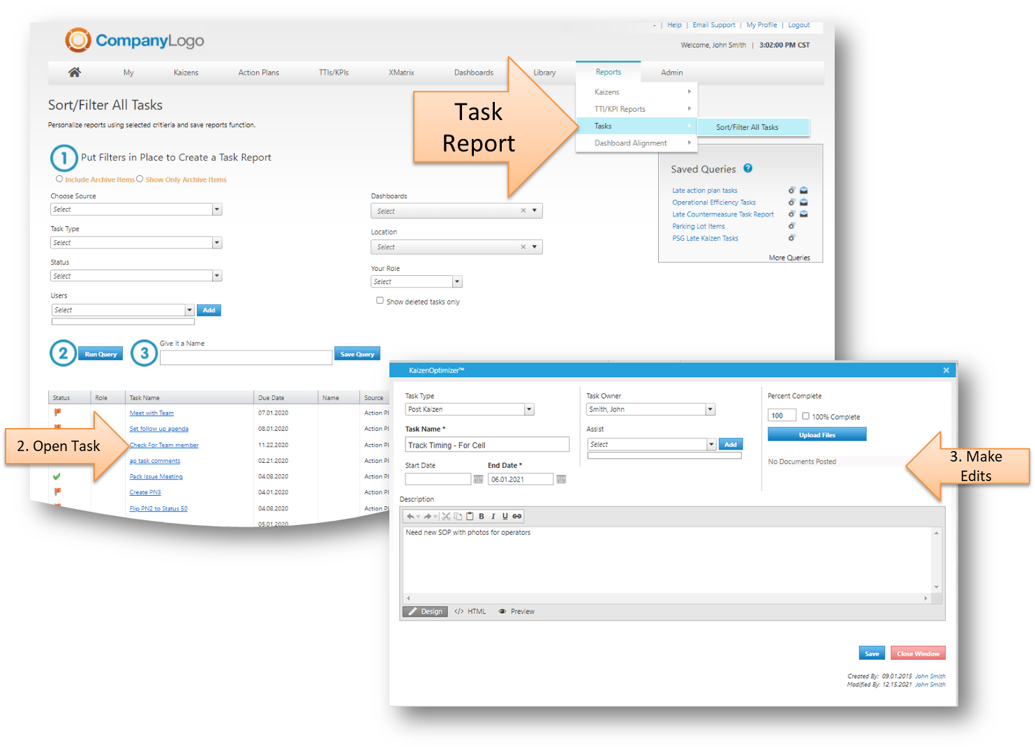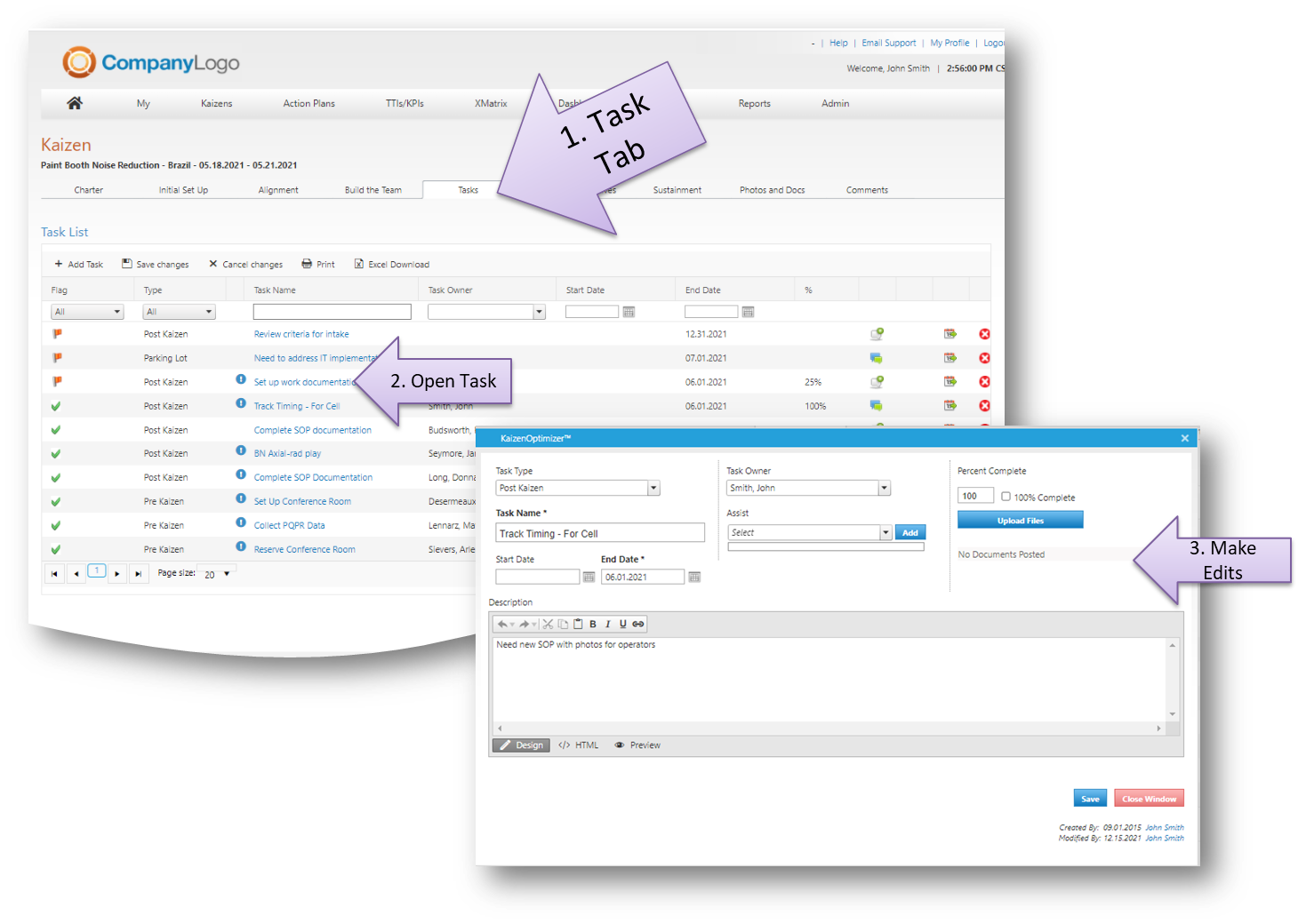 1. From the Kaizen, click on the Task tab 2. Click on the Task Name 3. Make your edits! 4. Click Save! |
